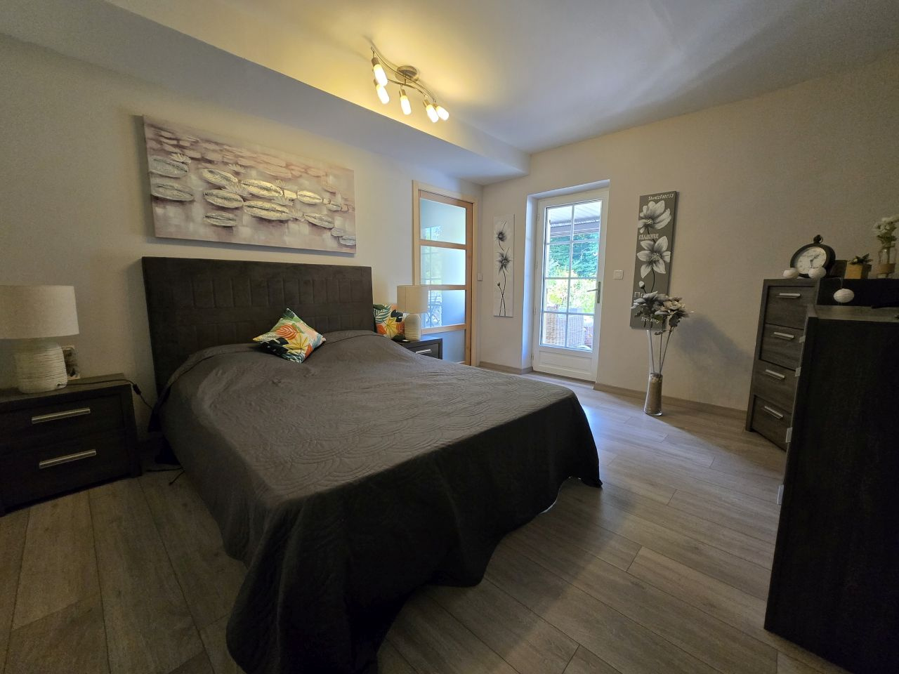 Attenant à la maison, un appartement indépendant permet d'accueillir amis ou famille. Il comprend un salon avec coin cuisine, une chambre, ainsi qu'une salle d'eau avec toilettes. Cet espace ouvre directement sur la piscine, protégée par un muret en pierres, idéale pour profiter des beaux jours.